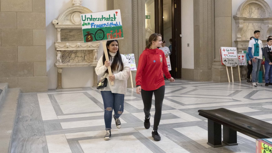 In Auseinandersetzung mit diesen historischen Kunstwerken erarbeiteten Schülerinnen im vergangenen Schuljahr in einwöchigen Workshops eigene, gesellschaftlich und politisch aktuelle Anliegen zu Themen wie „Kinderrechte“, „Umweltschutz“, „Rassismus“ oder „Mobbing“. In dem Projekt, das kulturelle und politische Bildung verbindet, entstanden Plakate, Sprechchöre und Performances mit Botschaften der Kinder und Jugendlichen.